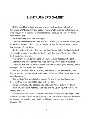 Bria loves nothing more than running the lightways, the luminal network used to carry sensitive messages through the Nuit System. Never one to look before she leaps, Bria ignores her old mentor's warnings about a risky mission. But he's proven right when the Speaker Elect of Osiris takes Bria's bad news personally.